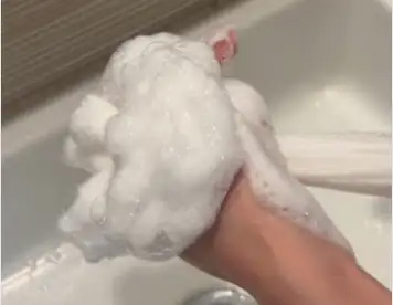 ※泡立てネットを使って、チャーガシャンプーの泡を作っています。